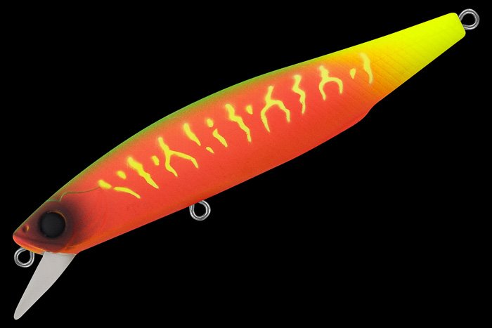 Особенности дизайна: DOMINANT 90SP имеет классическую для воблеров-минноу узкую и вытянутую форму тела. Верхняя часть боковой поверхности воблера выполнена в виде ромбовидных насечек, нижняя - в виде косых насечек, создающих эффект рыбьей чешуи. Головная часть воблера имитирует жаберные крышки рыбки. Вклеенные 3D-глаза завершают реалистичный дизайн приманки.