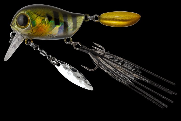 Особенности дизайна: KIKI 54F не похож на остальные воблеры-кренки, поскольку имеет в своей конструкции ряд оригинальных дополнительных элементов, призванных привлечь внимание хищной рыбы. Под брюшком у приманки находится подвижный металлический лепесток, который вращается при проводке, в задней части – жесткий пластиковый хвостик, который при движении в воде колеблется из стороны в сторону, а единственный тройник воблера оснащён мушкой из перьев и довольно длинных силиконовых нитей. Головная часть KIKI 54F рельефно имитирует жаберные крышки, а вклеенные объемные 3D глаза завершают реалистичный дизайн приманки.