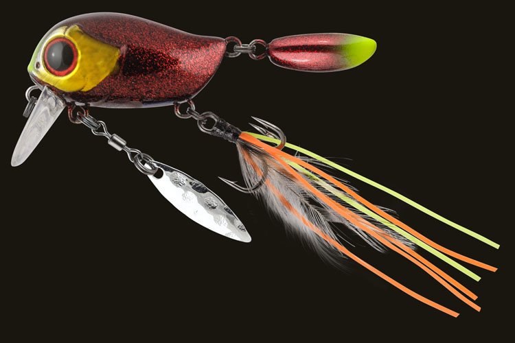 Особенности дизайна: KIKI 54F не похож на остальные воблеры-кренки, поскольку имеет в своей конструкции ряд оригинальных дополнительных элементов, призванных привлечь внимание хищной рыбы. Под брюшком у приманки находится подвижный металлический лепесток, который вращается при проводке, в задней части – жесткий пластиковый хвостик, который при движении в воде колеблется из стороны в сторону, а единственный тройник воблера оснащён мушкой из перьев и довольно длинных силиконовых нитей. Головная часть KIKI 54F рельефно имитирует жаберные крышки, а вклеенные объемные 3D глаза завершают реалистичный дизайн приманки.